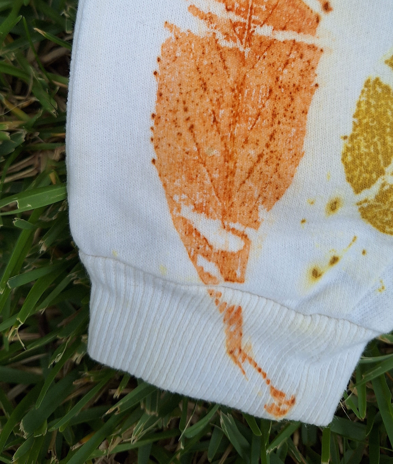 Upcycling - impressão botânica com espanta-lobos (Ailanthus altissima) e picão (Bidens sp.).