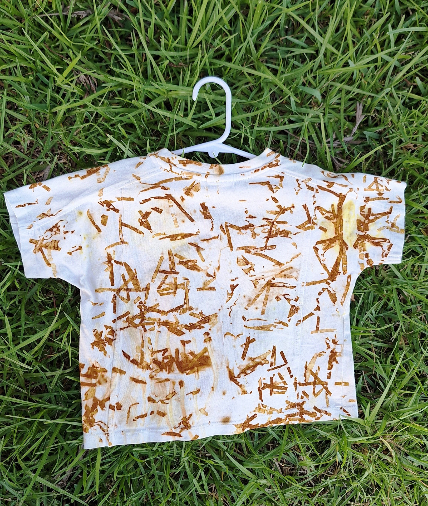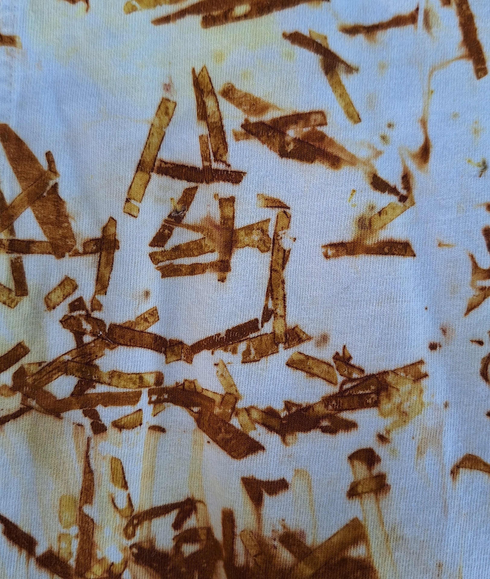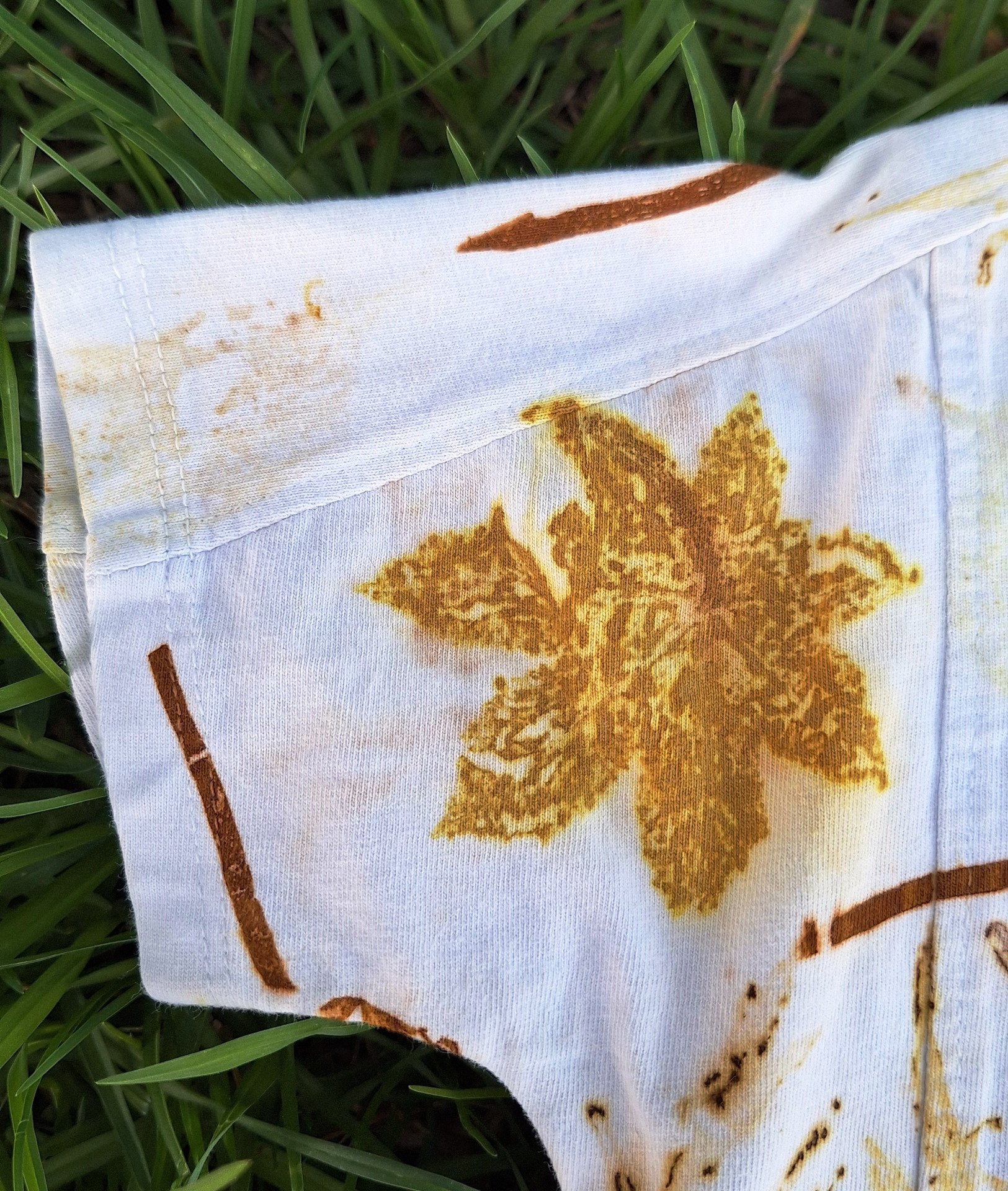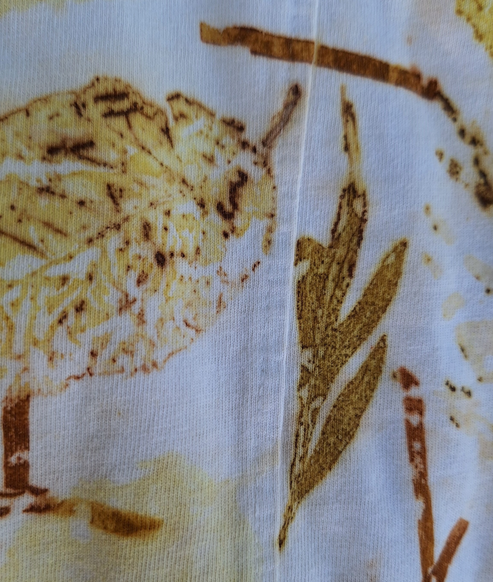 Upcycling - impressão botânica com várias plantas e cascas de cebola castanha.