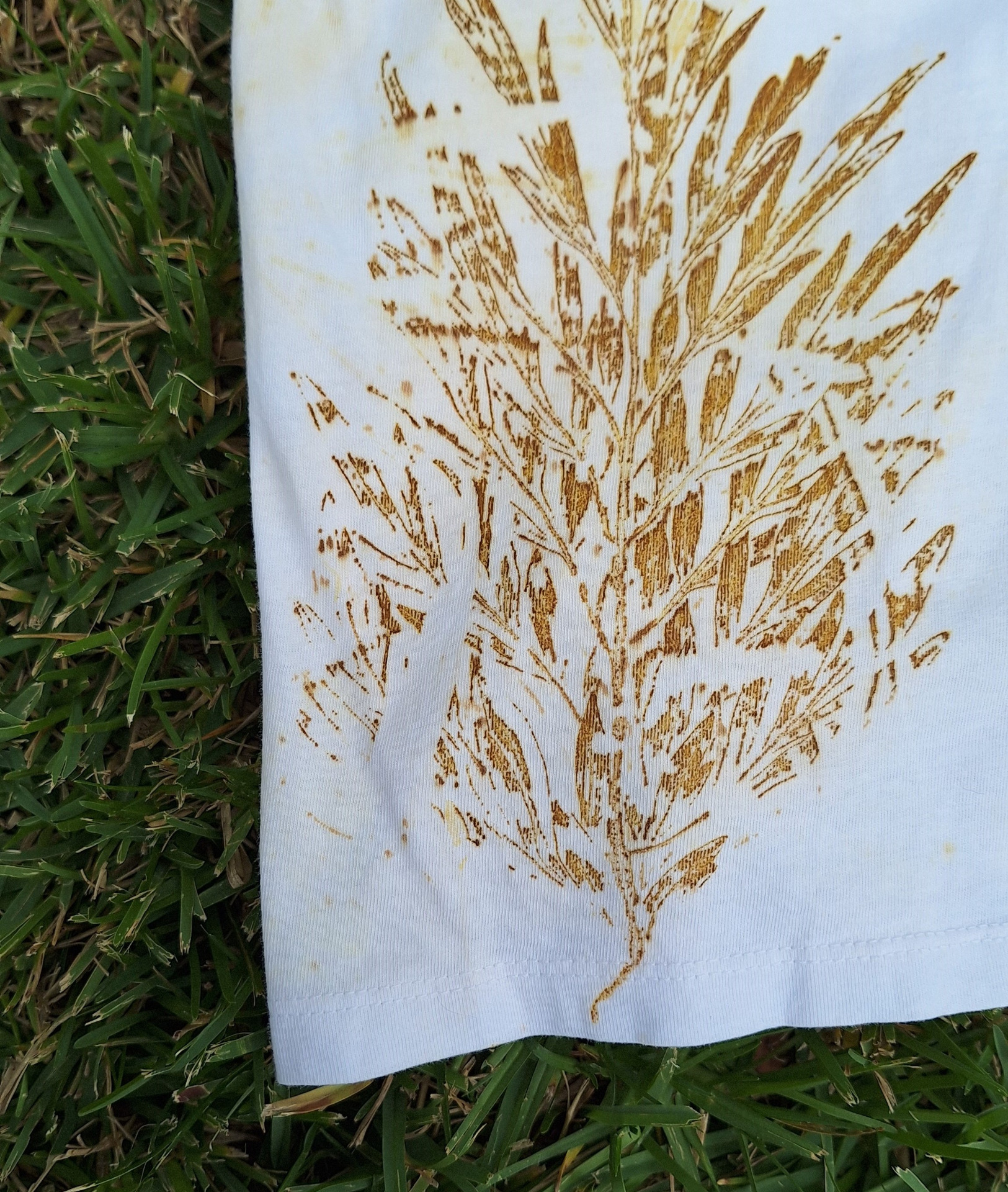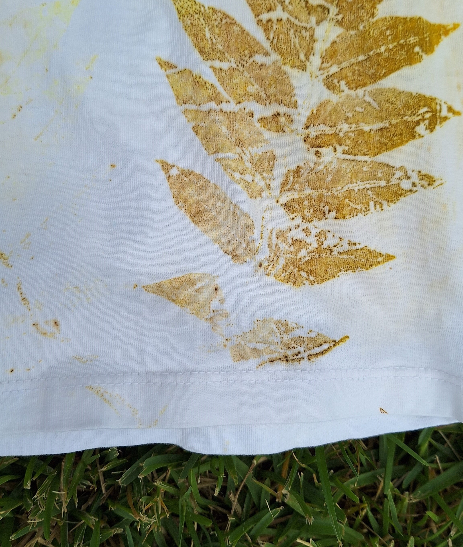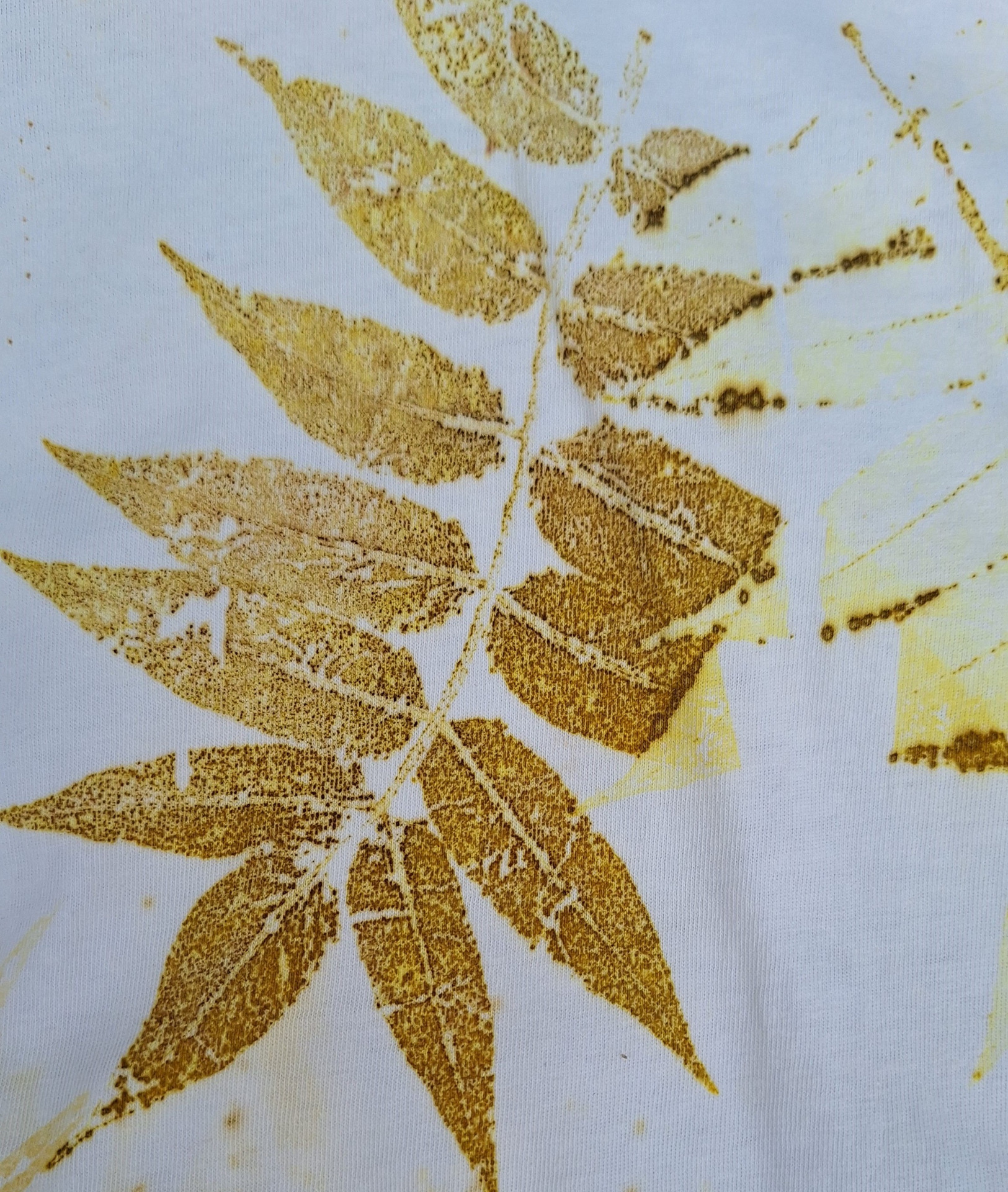 Upcycling - impressão botânica com castanheiro (Castanea sativa Mill.) espanta-lobos (Ailanthus altissima (Mill.)) e grevílea (Grevillea robusta A.Cunn).