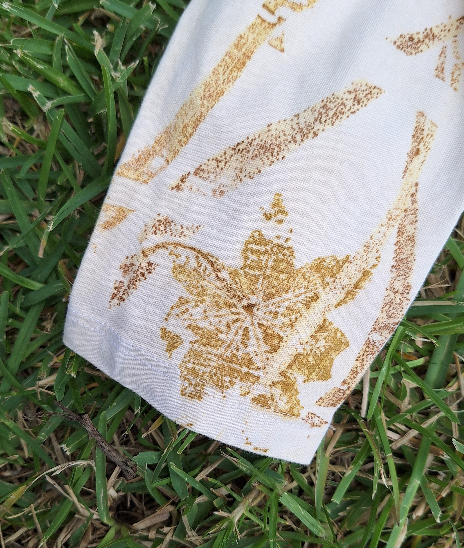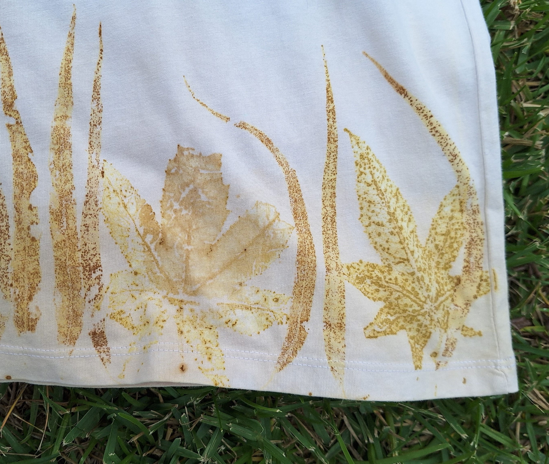 Upcycling - impressão botânica com Eucalipto (Eucalyptus sp. ) e Rícino (Ricinus communis L.).