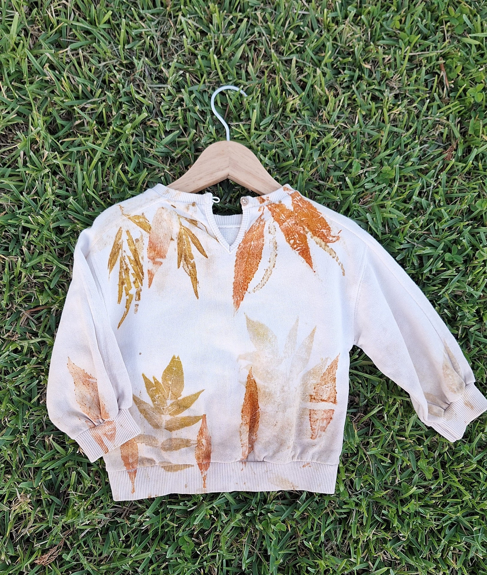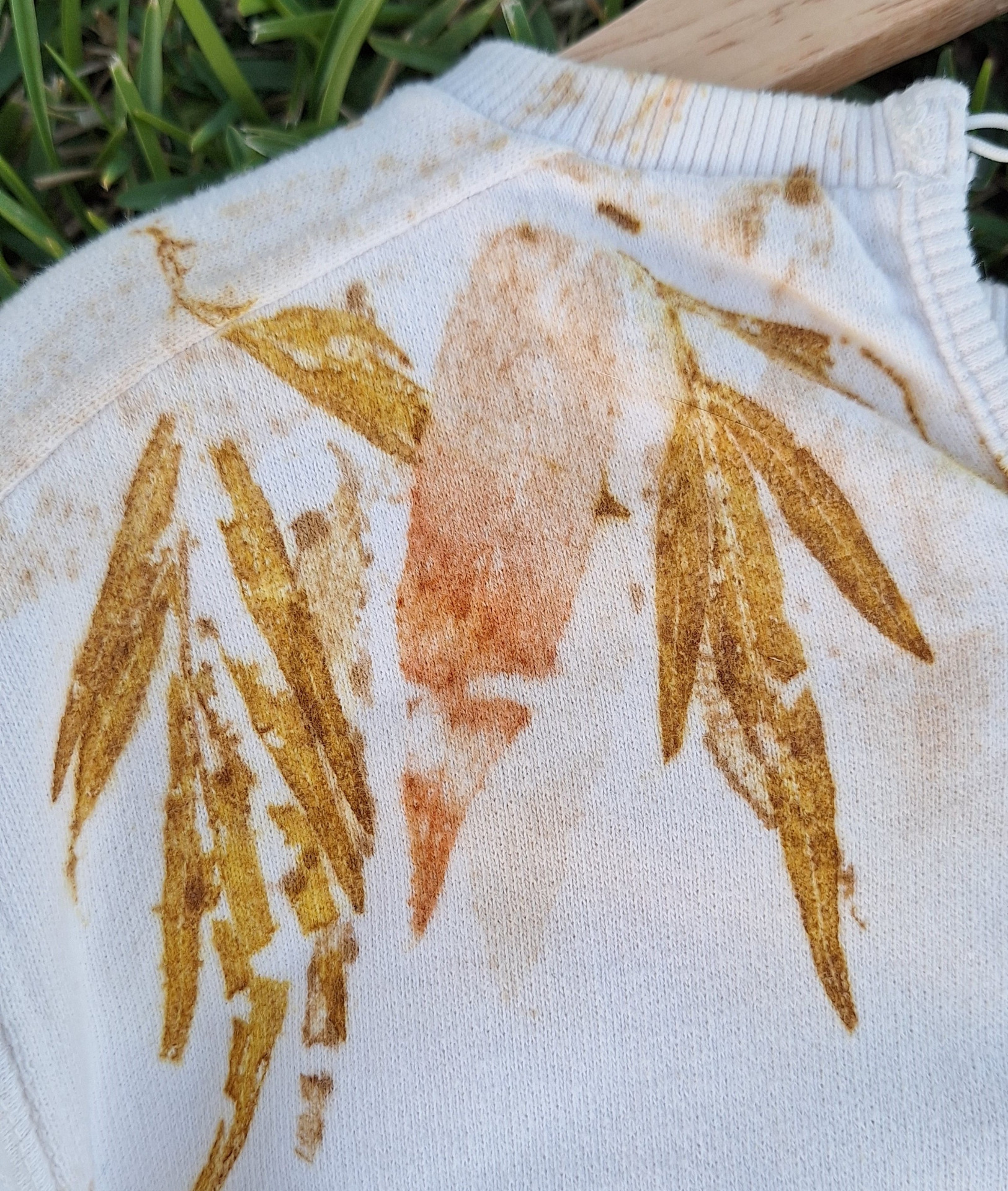 Upcycling - tingimento natural e impressão botânica com Picão (Bidens sp.), Eucalipto (eucalipto globulus), Espanta-lobos (Ailanthus altissima) e Grevílea (Grevillea robusta).